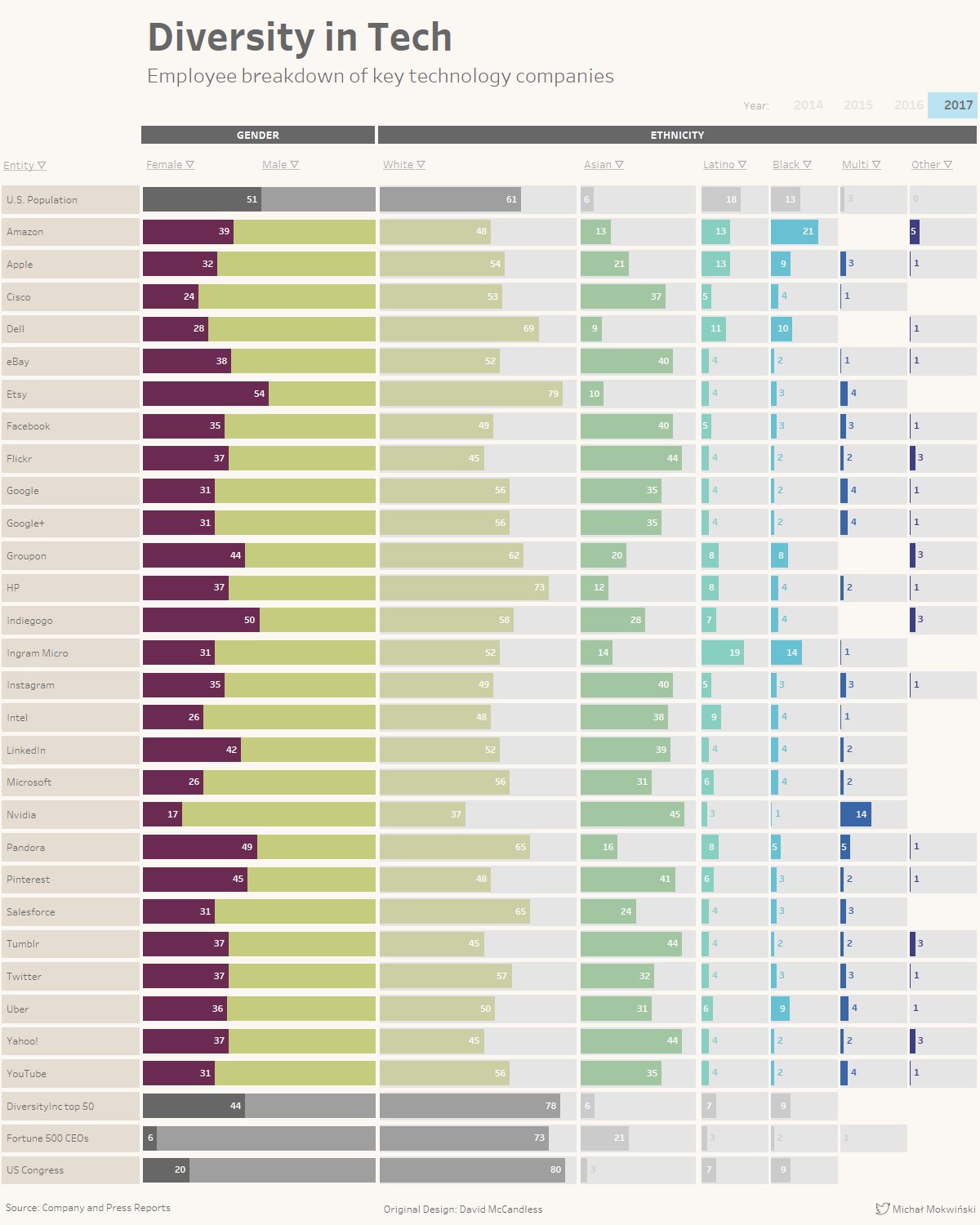 Jedną z takich opcji opiszę na przykładzie ostatniego #MakeoverMonday, gdzie skupiliśmy się na wizualizacji Davida McCandlessa - Diversity in Tech. Postanowiłem jak najwierniej odwzorować ją w Tableau, kładąc duży nacisk właśnie na znakomity UX. Tutaj kluczowe były dwa elementy - filtrowanie po kliknięciu na rok, oraz sortowanie po kliknięcu w nagłówek. Tak wygląda w Tableau efekt końcowy:
